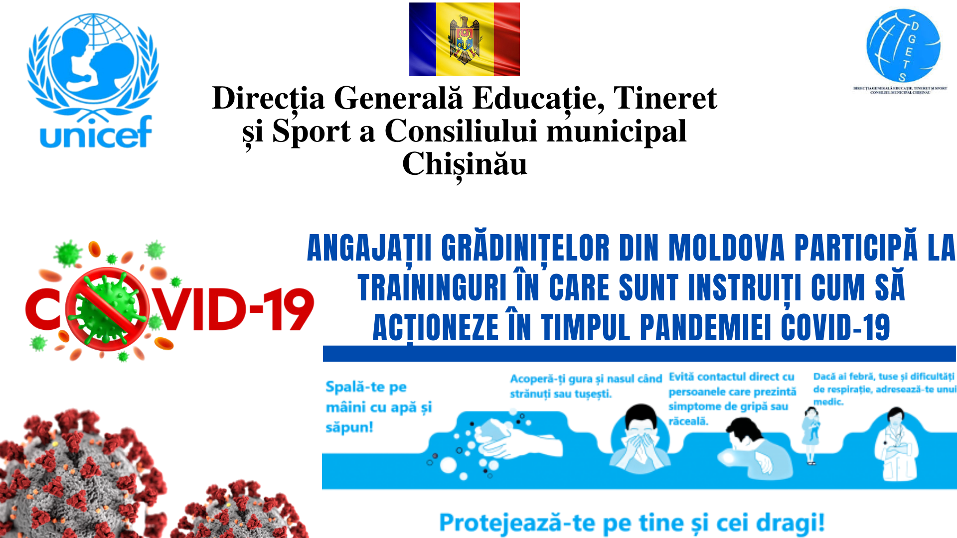 #UNICEF, în colaborare cu Ministerul Educației, Culturii și Cercetării al Republicii Moldova și Centrul Național pentru Educație Timpurie și Informare a Familiei Cnetif organizează o serie de traininguri despre protecția și controlul #COVID19 pentru personalul managerial, didactic și non-didactic (asistente medicale, dădace, asistente de educatoare, bucătari, femei de serviciu, etc.) din cadrul instituțiilor preșcolare din Republica Moldova. Trainingurile sunt livrate ca parte a Proiectului Umanitar, implementat cu suportul financiar al USAID Moldova.