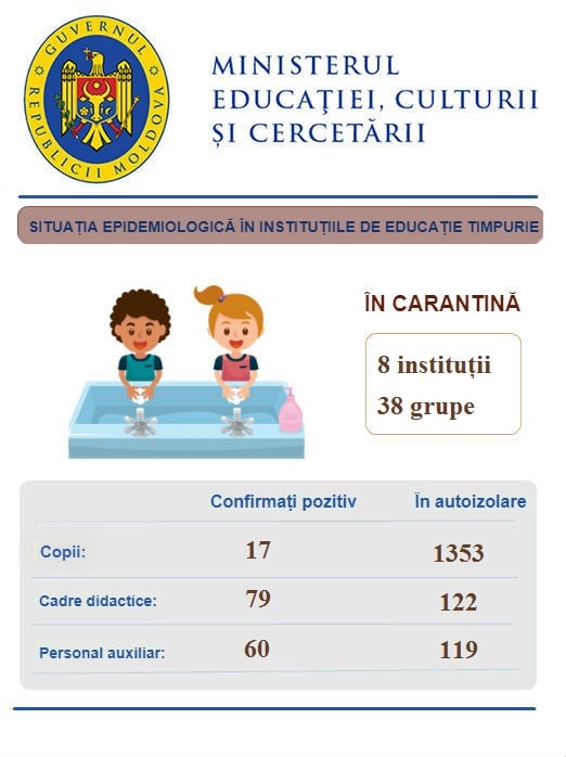 În învățământul de educație timpurie, 8 grădinițe și 38 grupe de copii se află în carantină. Copii confirmați pozitiv cu virusul COVID-19 sunt 17, iar alți 1353 de copii se află în autoizolare. 79 cadre didactice au fost confirmate pozitiv cu noul Coronavirus, în autoizolare se află 122 cadre didactice. Din personalul nedidactic și auxiliar au fost infectate cu noul virus 60 de persoane, iar alte 119se află în autoizolare.