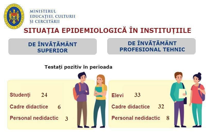 În învățământul profesional tehnic, în perioada 08-12 februarie, au fost înregistrați 33 elevi testați pozitiv cu virusul Sars-Cov-2, 32 – cadre didactice și 8 din personalul nedidactic și auxiliar. De asemenea, 41 grupe de elevi sunt plasate în autoizolare.